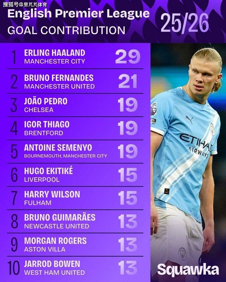 数据机构Squawka统计了本赛季英超球员的参与进球(进球+助攻)数量,并列出榜单。曼城前锋哈兰德以29球高居榜首,展现出恐怖的进攻效率。曼联核心B费以21球位列次席,切尔西前锋若昂·佩德罗与布伦特福德前锋伊戈尔·蒂亚戈、曼城边锋塞梅尼奥同以19球并列第三。
